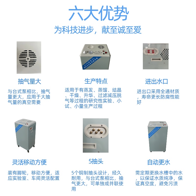 循環(huán)水真空泵是大功率多頭抽氣的一種新型循環(huán)水式多用真空泵,本機(jī)設(shè)計(jì)內(nèi)外循環(huán)水,可以五頭同時(shí)抽氣,具有不用油、功率大、噪音低、方便靈活,節(jié)水省電等優(yōu)點(diǎn),一機(jī)多用。