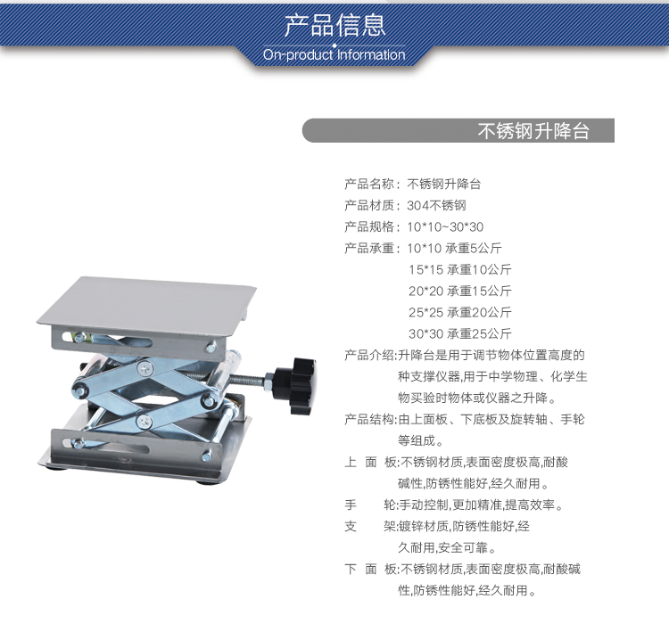 升降臺是用于調節平臺高度的支撐儀器,用于中學物理,化學生物實驗室物體或實驗之升降。